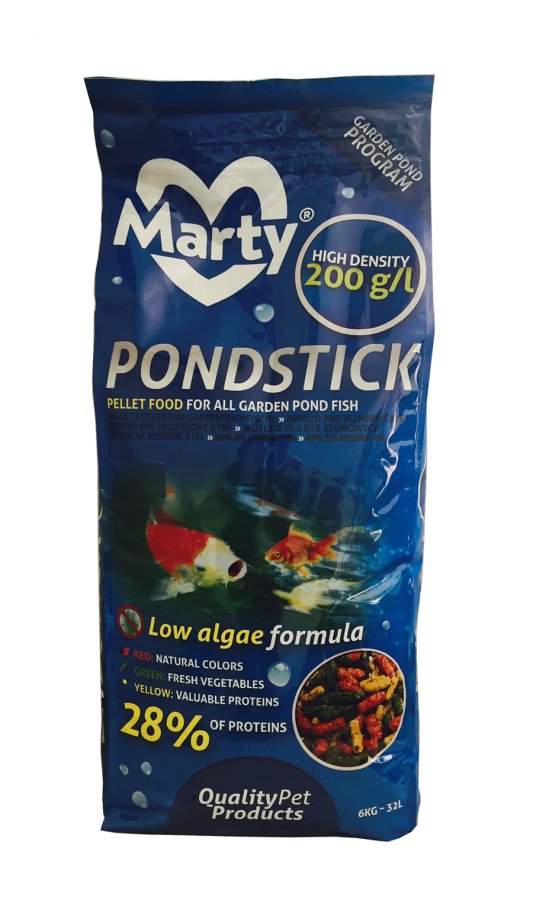 MARTY PondStick 200 g/l je peletové krmivo pro ryby v zahradním jezírku typu "Pond Sticks" s největší hustotou na trhu, a to 200 g/l, zatímco ostatní klesají až k 80 g/l. to znamená, že nekupujete vzduch, ale opravdové krmivo.