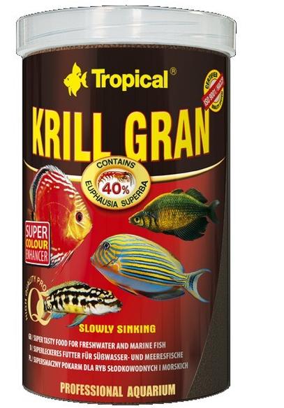 Mnohosložkové vybarvující krmivo ve formě potápějících se granulí s krilem. Mnohosložkové vybarvující krmivo ve formě potápějících se granulí s vysokým obsahem arktického krilu (40%). Je určeno ke každodennímu krmení všežravých a masožravých ryb v mořských i sladkovodních akváriích. S ohledem na vysokou chutnost se hlavně osvědčuje ve výživě ryb, které neznají hotová krmiva (ryby z odlovu) a dále ryb s vysokými výživnými nároky. Arktický kril, který je v krmivu obsažen, obohacuje toto krmivo o cenné bílkoviny, aminokyseliny, chitin, nenasycené mastné kyseliny, v tom Omega-3 a také karotenoidy pocházející z přírodních zdrojů. Ryby, které jsou pravidelně krmeny krmivem KRILL GRAN dosahují intenzivního vybarvení a dokonalou kondici a také ochotně přistupují ke tření.