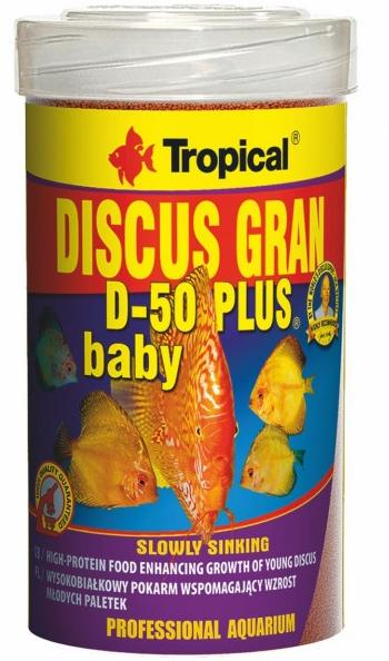 Pomalu se potápějící granule s nezvykle velkým obsahem vysoce stravitelné bílkoviny (55%) pro mladé cichlidy. Živočišné a rostlinné suroviny byly vybrány tak, aby rostoucím rybám dodali všechny nezbytné plnohodnotné exogenní bílkoviny, nutné pro jejich zdravý růst. Imunitu mladých ryb posiluje beta-glukan a také aktivní látky obsažené v česneku, droždí, spirulině a řasách Kelp. Vaječné žloutky jsou zdrojem lehce stravitelného lecitinu, který je nezbytný pro rozvoj a fungování organizmu. Abychom uspokojili vysoké nároky potěru na kyseliny omega-3, přidali jsme do krmiva suroviny bohaté na polynenasycené mastné kyseliny, mezi jiným i mořské korýše a olej z ryb. Při pravidelném krmení mladých cichlid krmivem TROPICAL DISCUS GRAN D-50 PLUS BABY, rostou ryby rychle a správně se rozvíjejí díky příjmu nezbytných živin ve vhodných proporcích. Krmivo může být zároveň použito pro výživu potěru i jiných druhů ryb s vysokými stravovacími návyky.