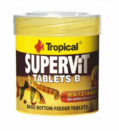 Mnohosložkové krmivo ve formě zvolna klesajících tablet. Mnohosložkové krmivo ve formě zvolna klesajících tablet, určené ke každodennímu krmení všežravých a masožravých ryb žijících u dna, např. sekavců, sumečků, přísavek, a to i větších jedinců. SUPERVIT TABLETS B je také výborné krmivo pro korýše, slimáky a vodní želvy. Obsažený v krmivu přírodní imunostimulátor – beta-glukan a stabilizovaný vitamín C posilují imunitní systém, což významným způsobem pomáhá organismům zvířat bojovat s patogenními látkami. Několik desítek pečlivě vybraných složek špičkové kvality, doplněných optimálně zvoleným spektrem vitamínů a mikročástic, zajišťuje potřebné živiny a energií i pro ty nejnáročnější druhy ryb.