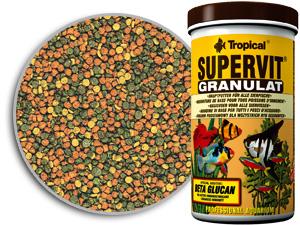 Mnohosložkové krmivo ve formě drobného, potápějícího se granulátu určené pro denní krmení všežravých akvarijních ryb. V krmivu obsažený přírodní imunostimulátor - beta-glukan a stabilizovaný vitamín C posilují imunitní systém, což podstatným způsobem podporuje organismus ryb v boji s patogeny. Několik desítek vybráných složek nejvyšší jakosti, doplněných optimálně vybranou sestavou vitaminů a mikroelementů, zajišťuje vyživovací a energetické potřeby většiny druhů ryb. Neobyčejně bohatá receptura krmiva Supervit Granulat způsobuje, že krmivo má zvláštní použití v populárních mnohodruhových akváriích. Doporučujeme též jiné granuláty: Spirulina Granulat, Vitality-Color Granulat