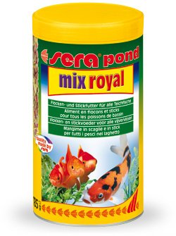 Sera pond mix royal obsahuje pro každou bazénovou rybu to správné krmivo: granulky bohaté na energii a balastní látky pečují o vyváženou a rozmanitou potravu pro každou rybu od velikosti cca 6 cm. Menší ryby jsou vyživovány šetrně zpracovanými vločkami, které obsahují cenné obilné produkty, rybí bílkoviny a vedlejší rybí produkty a samozřejmě vitaminy. Obzvláště chutnou a na proteiny bohatou delikatesou pro každou rybu v rybníčku jsou pak přírodní krmná zvířata gamarus (blešivci), kterými rozmazlíte každou rybu