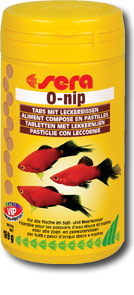sera O-nip jsou oblíbené specielní krmné tablety pro všechny sladkovodní i mořské ryby a mnoho bezobratlích. Obsahuje 50 % vysoce kvalitního vločkového krmiva a 50% lyofilizovaného krmiva (FD). Tabletu lehce přitlačte na vnitřní stěnu akvária. sera O-nip® je také vysoce kvalitním krmivem pro sumečky a mřenky