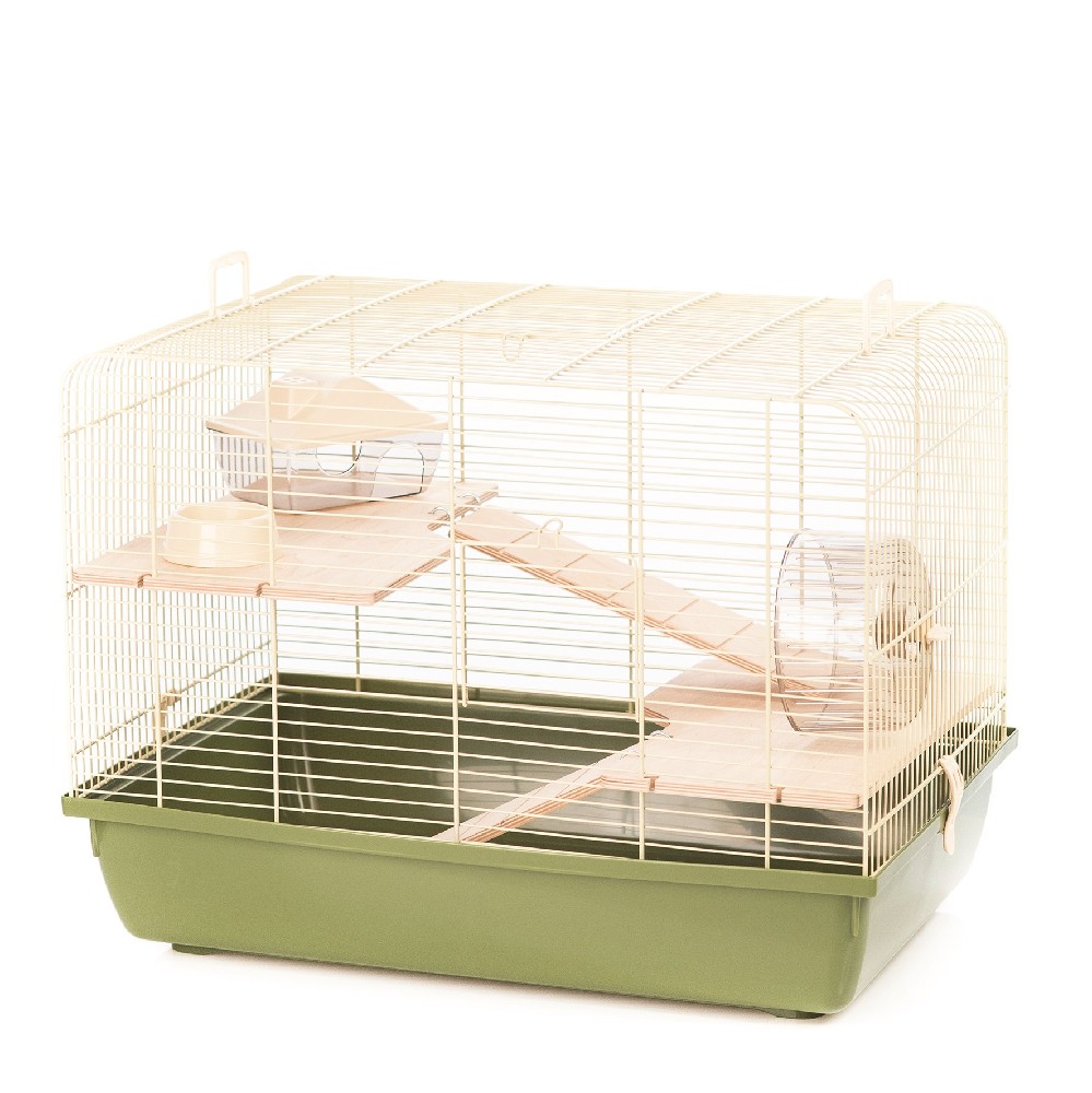 Součástí klece jsou dřevěná patra s rampu a plastové vybavení (domeček, kolotoč, miska).