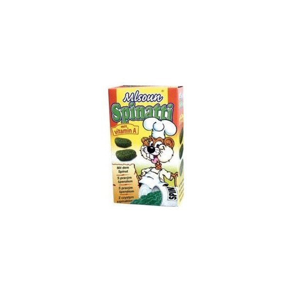 Mlsoun Spinatti je doplňkové krmivo pro králíky a hlodavce (morče, potkan, osmák, činčila, křeček, myš, pískomil) a obalovaná špenátová pochoutka pro hlodavce. Balení: 50g