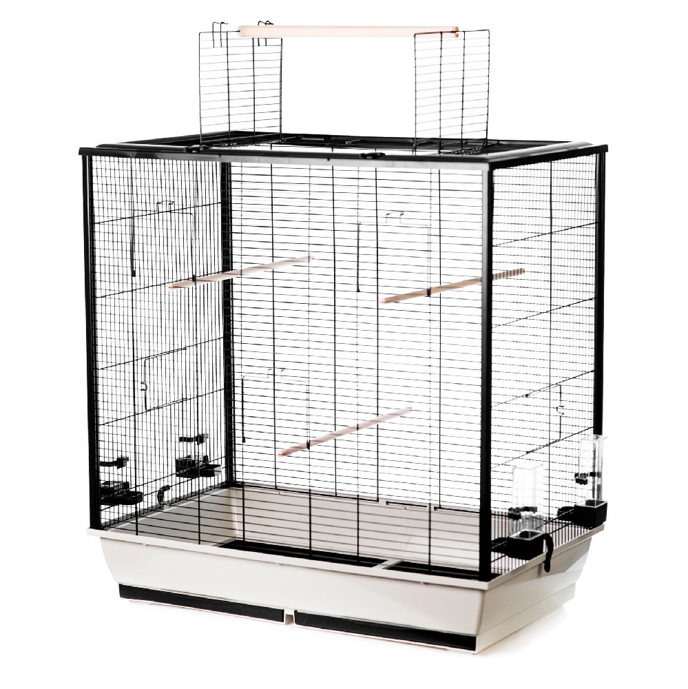 Odlehčená klec pro středně velké papoušky s plastovým rámem.