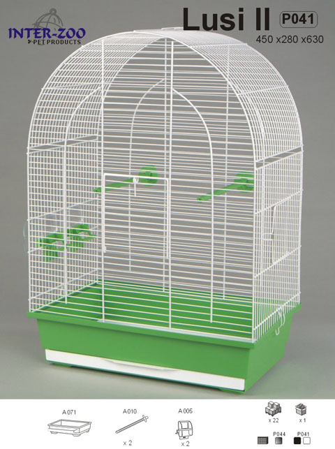 Klec LUSI II. - klec pro ptáky, obsahuje 2 krmítka (1 na krmení, 1 na vodu), 2 plastové bidýlka. Dno klece je vytahovací, což je výhodné pro snadný úklid klece.