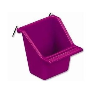 Malé plastové krmítko k zavěšení zevnitř klece pro exotické ptactvo.